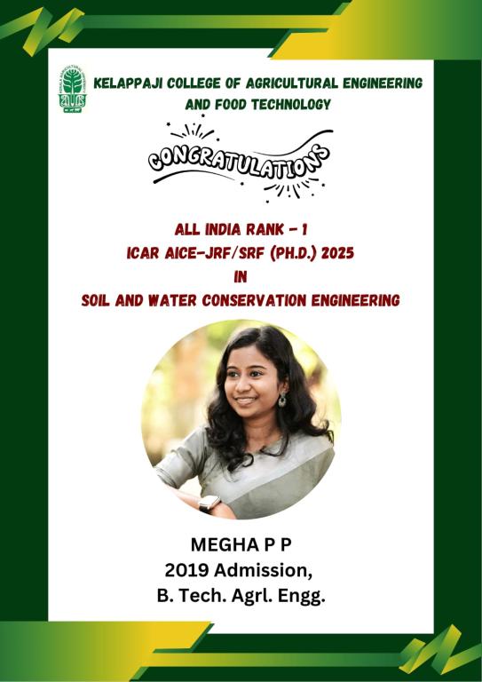 KCAEFT Alumna Ms. Megha P.P. (2019 Admn. B.Tech. - Agrl. Engg.) secured AIR-1 in ICAR AICE JRF/SRF (Ph.D.) 2025 in the discipline of Soil and Water Conservation Engineering